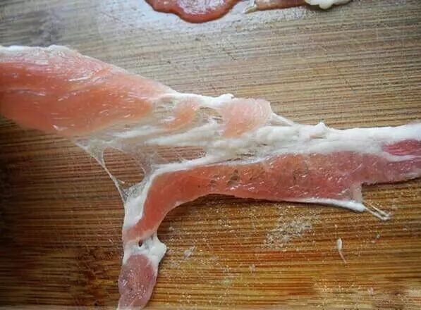 假羊肉最好的方法就是,把羊肉片化凍?;瘍龊蟮募傺蛉馄⒖叹惋@出了原形,我們看一下下面這張圖,化凍后的假羊肉紅肉和白肉輕輕一碰就分開了,一看就不是自然長(zhǎng)成的肉。